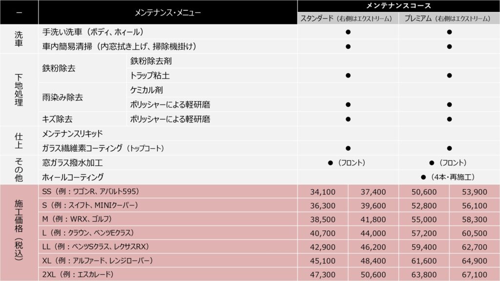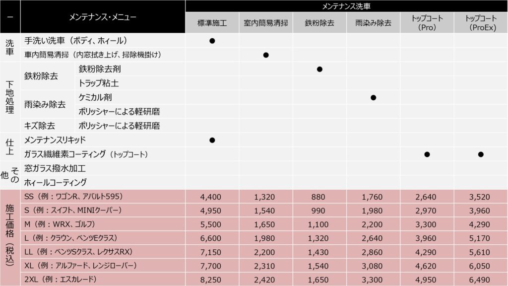 メンテナンスメニュー(洗車&メンテナンス施工)