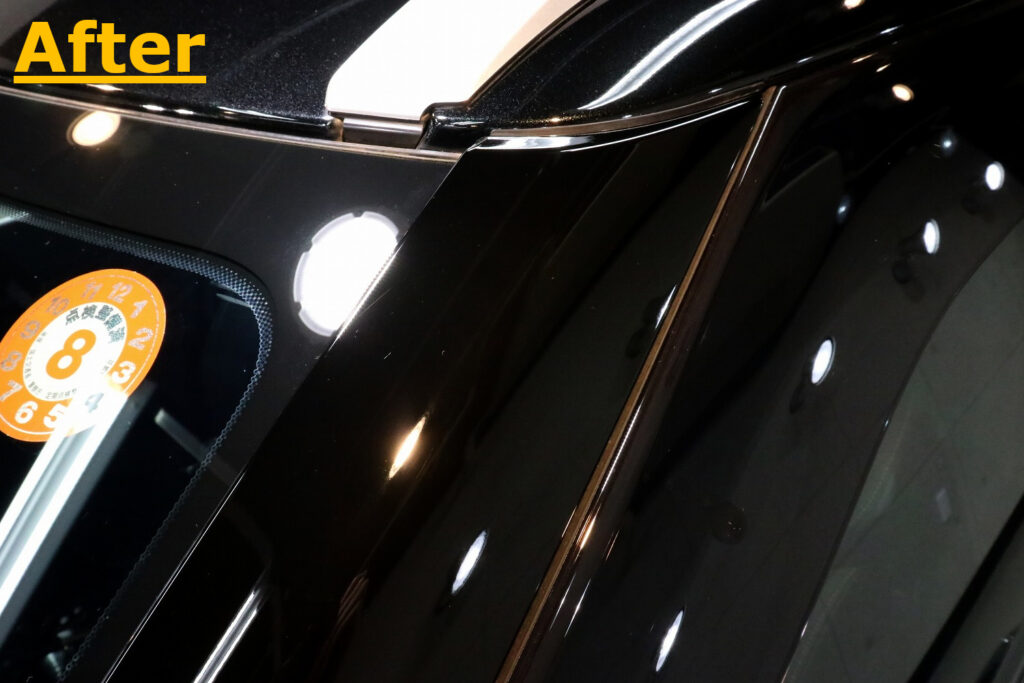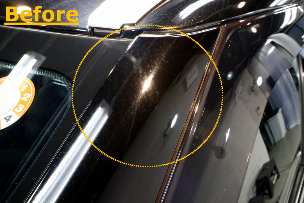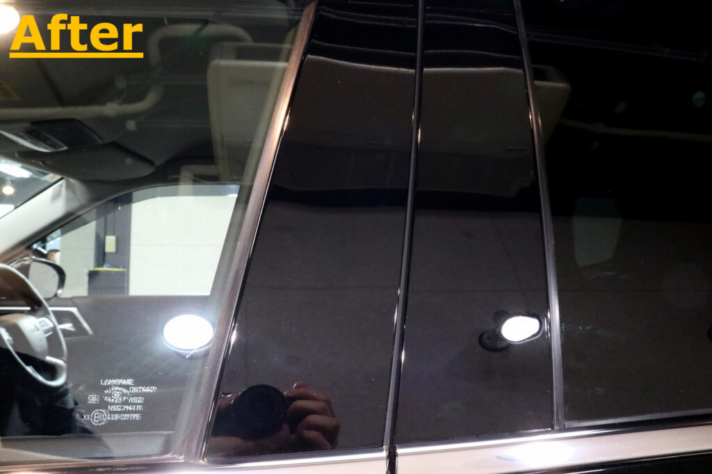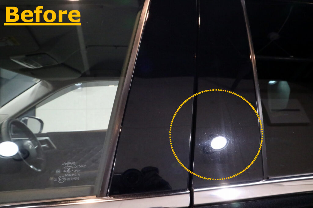 ピラーはピアノブラック塗装なのでキズが目立つと経年感が強く出てしまいます。逆にキズを除去すると新車のような印象になります。