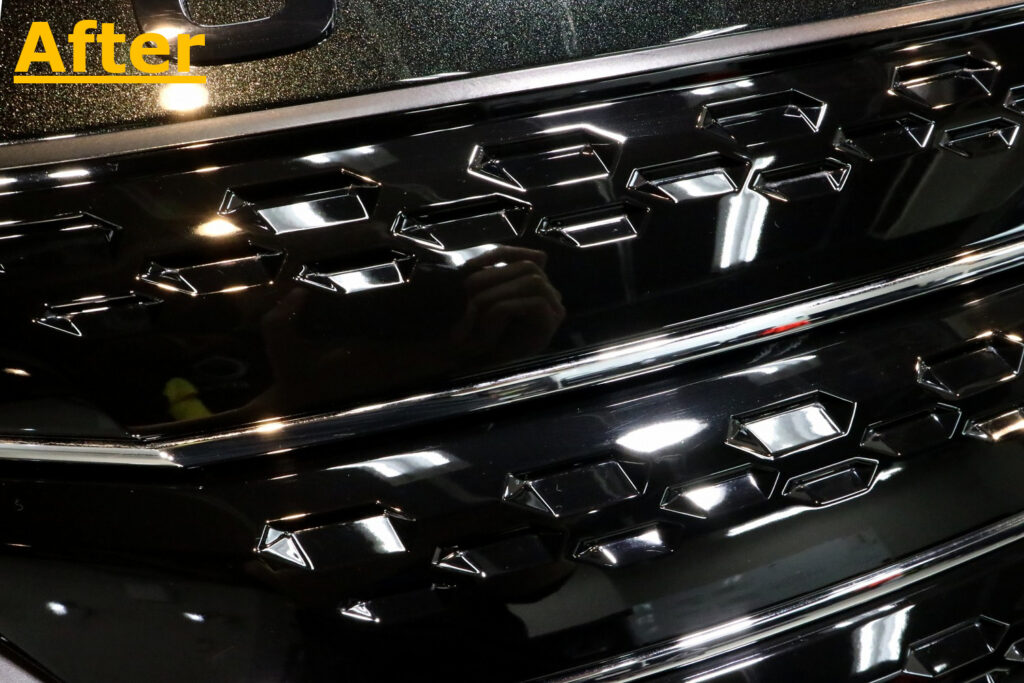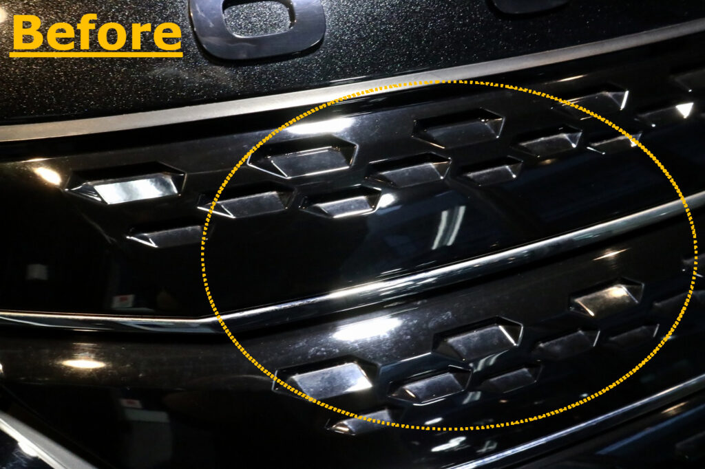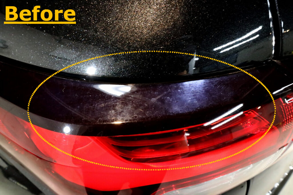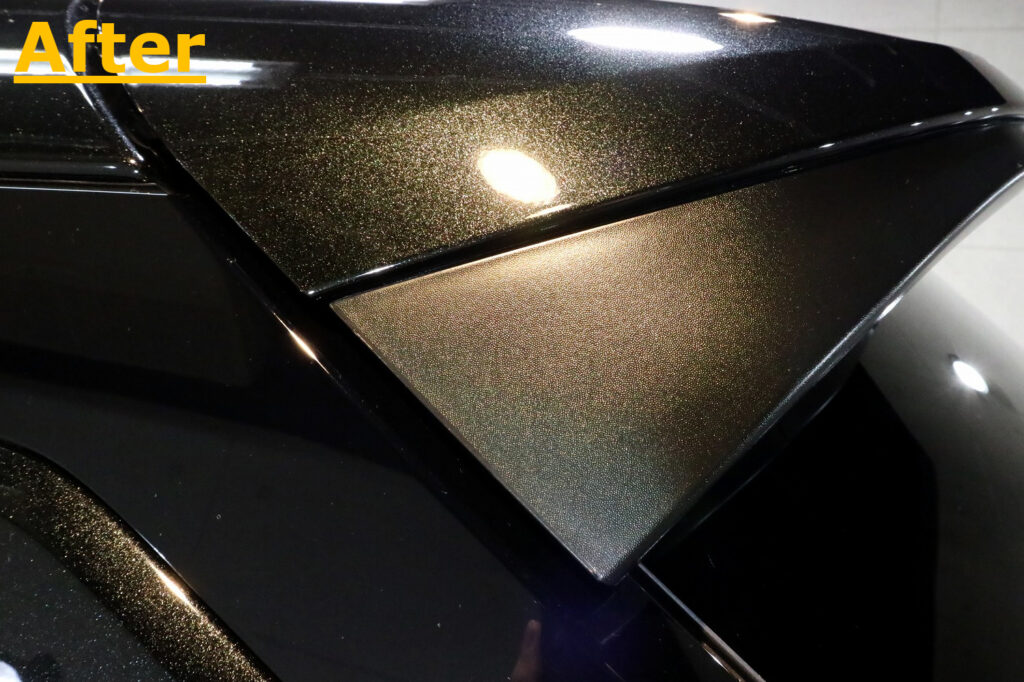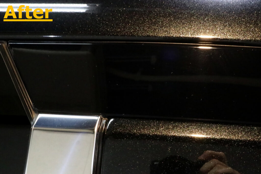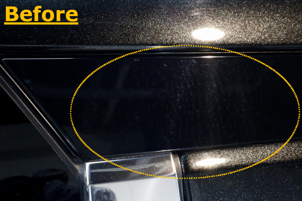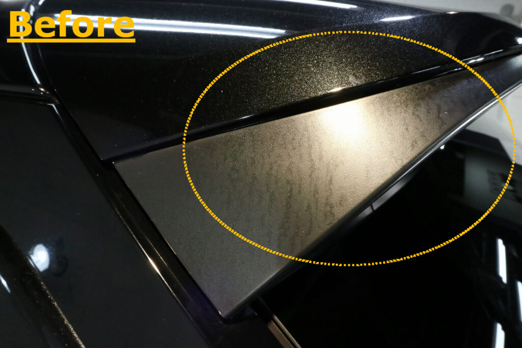 最近の高級車のピラーにはピアノブラック樹脂が使われるようになりましたが、キズがあると経年感が強くなるので、できる限り研磨を行いキズを除去します。