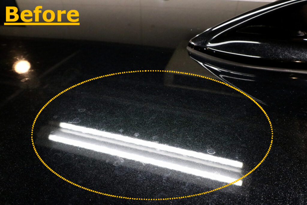 ボンネットはルーフと同様に染みが付きやすいパーツであるとともに、車の顔なのでキズや水染みをできる限り除去します。