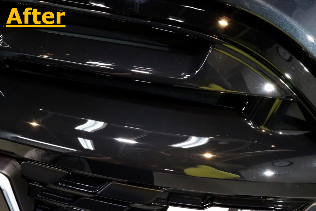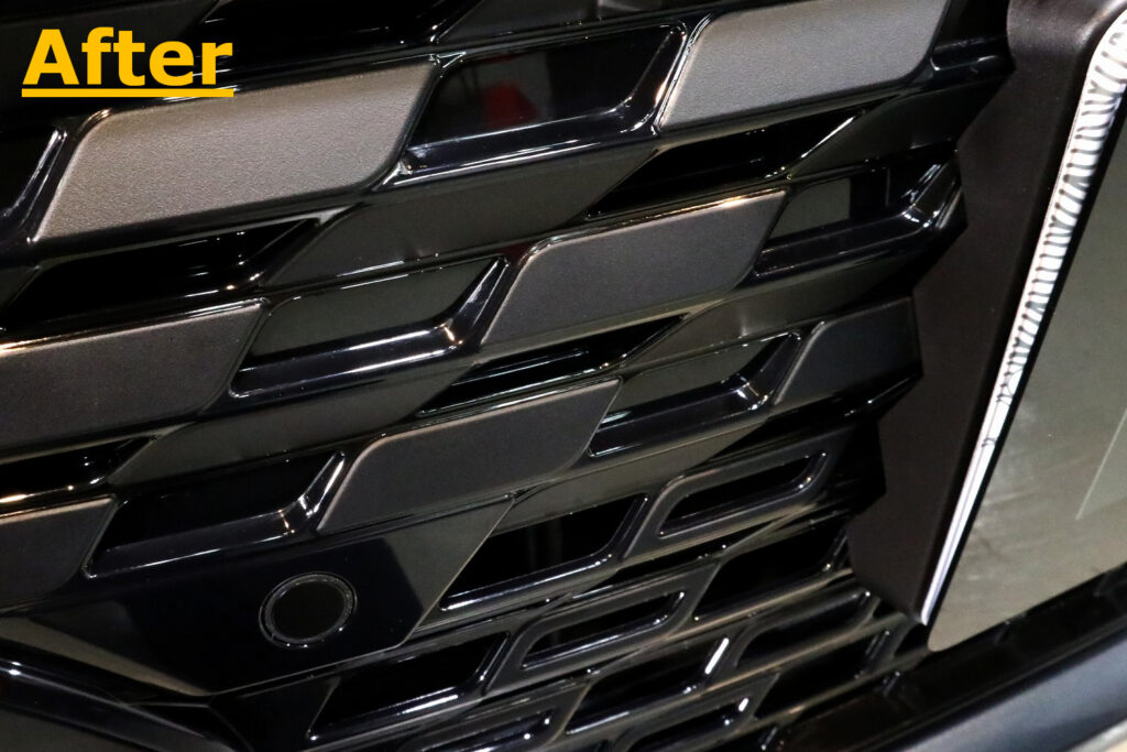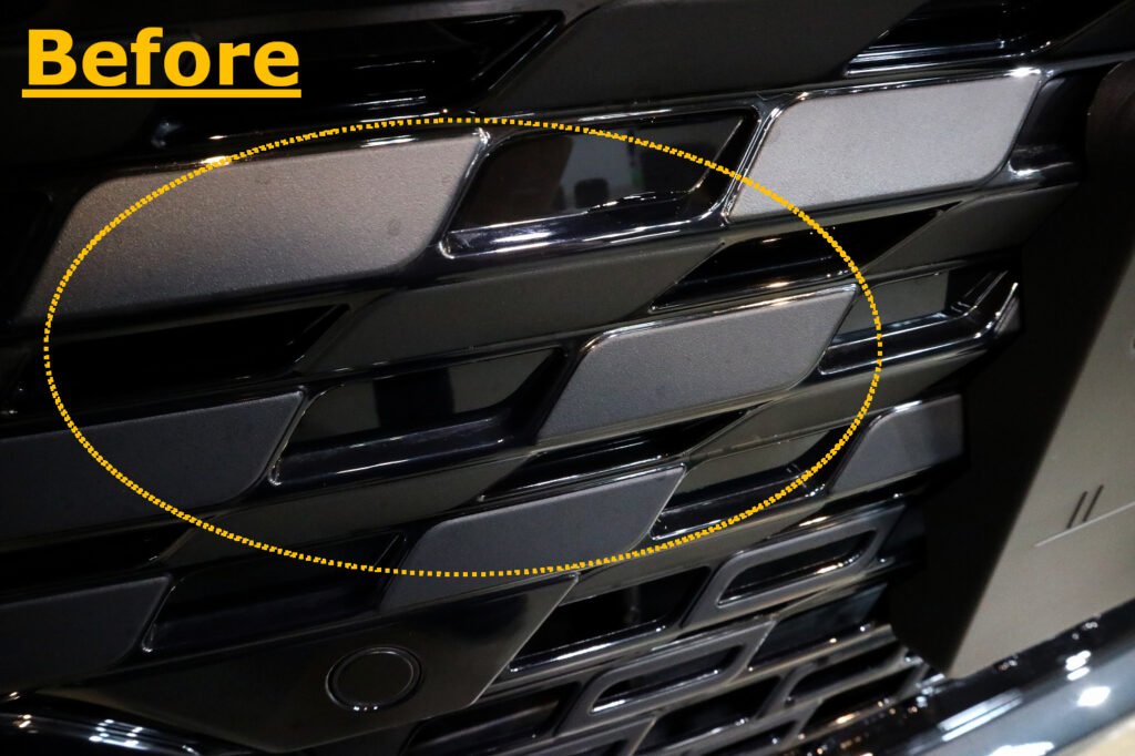 フロントグリルには、洗車では取れない水染みがありました。こういった未塗装樹脂パーツは研磨ができないため、ケミカル剤で洗浄による除去します。