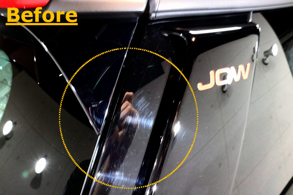 フロントグリル同様に塗装樹脂には洗車キズと思われる多くのキズがありました。