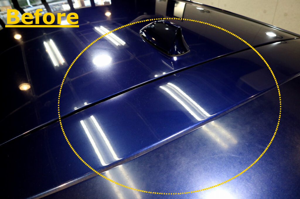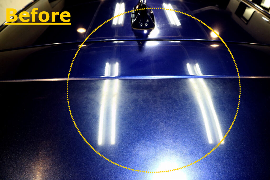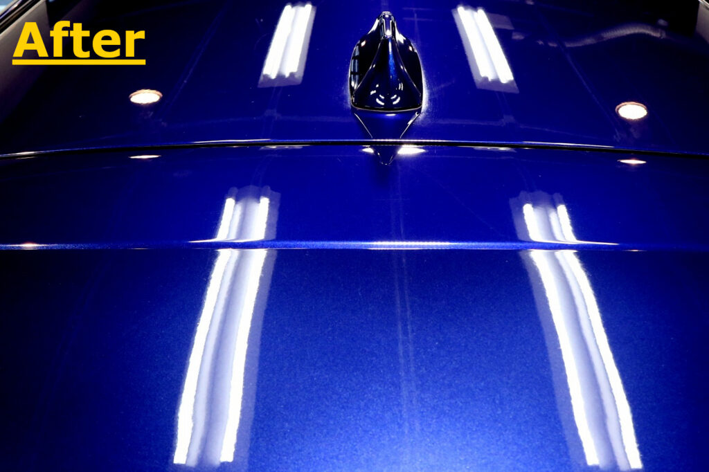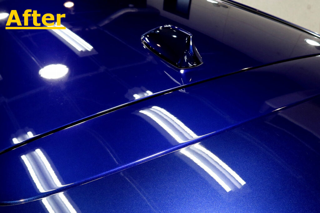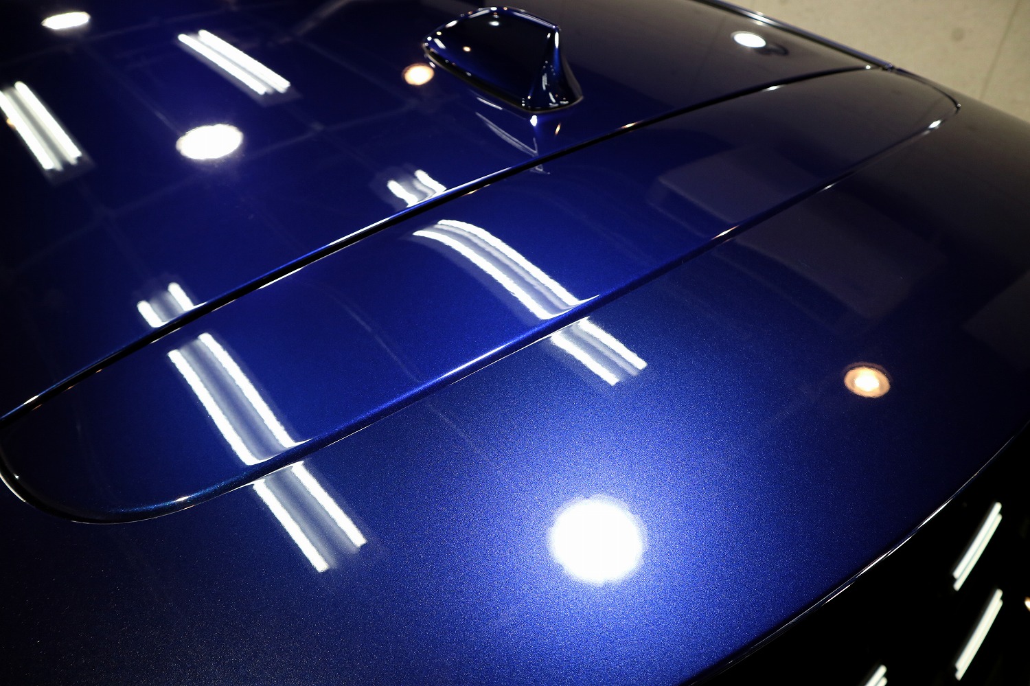 リボルトでは、コーティングの前に、高度な下地処理(Revolt Adjust System)を行いますので、経年車であってもできるかぎりキズや汚れ、水染みを除去するための下地処理を行なってからコーティングを行います。下地処理は見た目はもちろんのことですが、コーティング剤の定着を良くします。今回は5年の経年車ですので、下地処理にも手間がかかりました。最初は反射光が乱反射して白っぽく見えたのですが、下地処理後は元のラピスブルーパールがよみがえりました。
