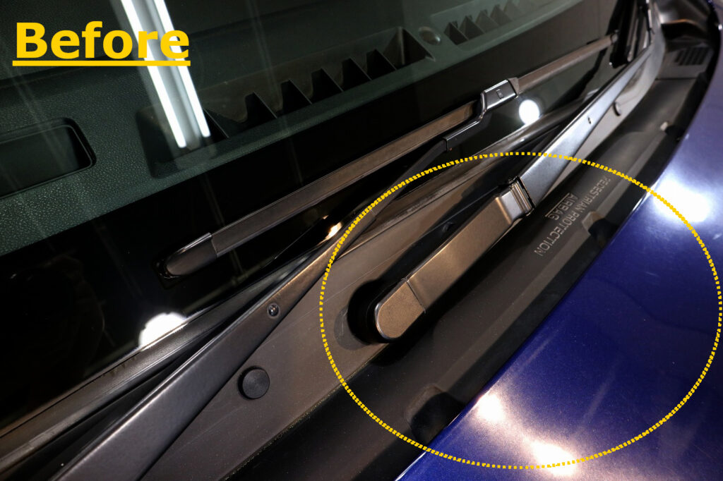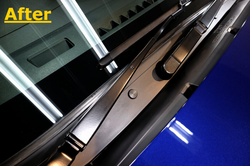 お奨めのオプションであるカウルトップ+ワイパーコーティングは、未塗装樹脂やワイパーの背中をしっとりさせます。下地処理で研磨はしませんがケミカル剤による洗浄を行います。