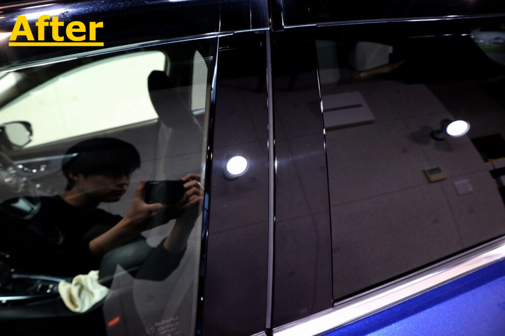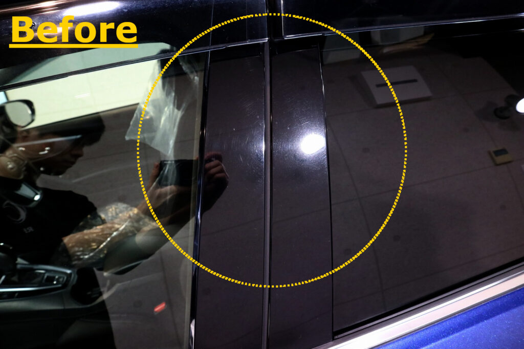 ピアノブラック樹脂のセンターピラーのキズは経年感を出すので、研磨によりできる限り除去しました。