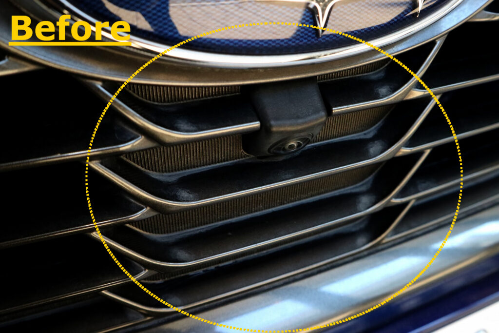 未塗装樹脂のフロントグリルは汚れや水染みが付着していました。ケミカル剤と研磨によりできる限り除去をします。コーティング後は黒くしっとりした状態になります。