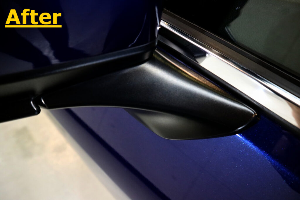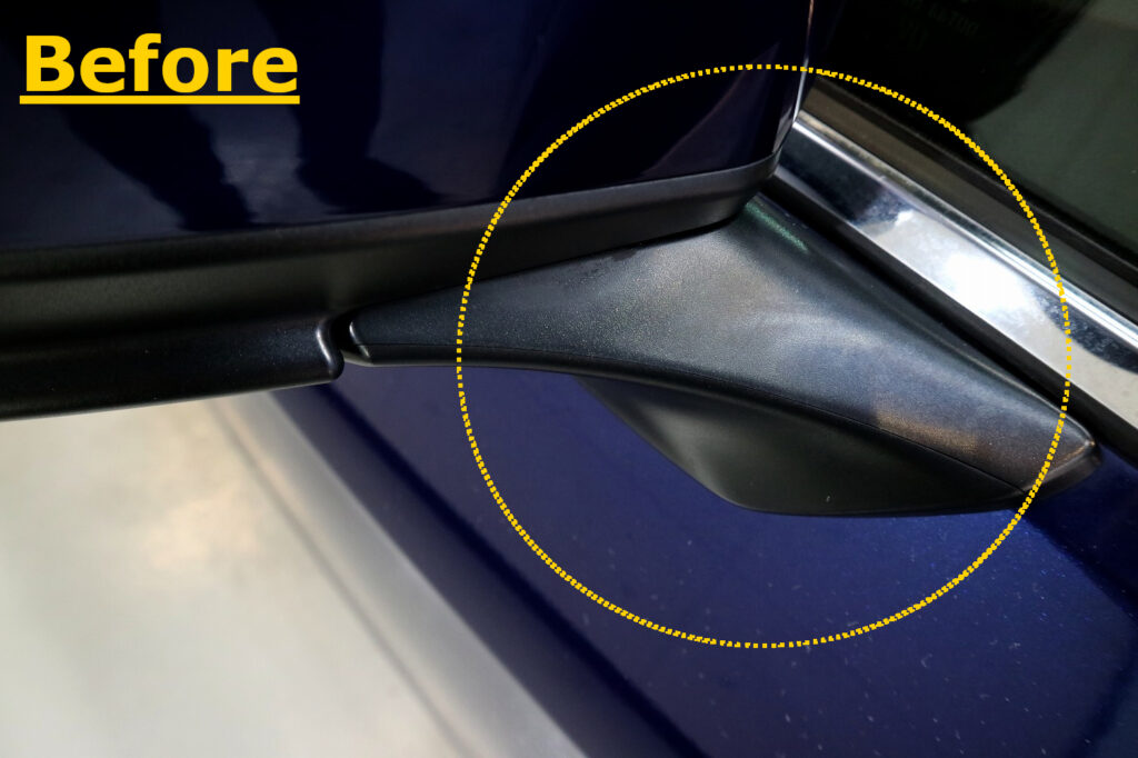 サイドミラーにも水染みが目立ちました。未塗装樹脂製のパーツなのでケミカル剤により洗浄をしコーティングをしました。