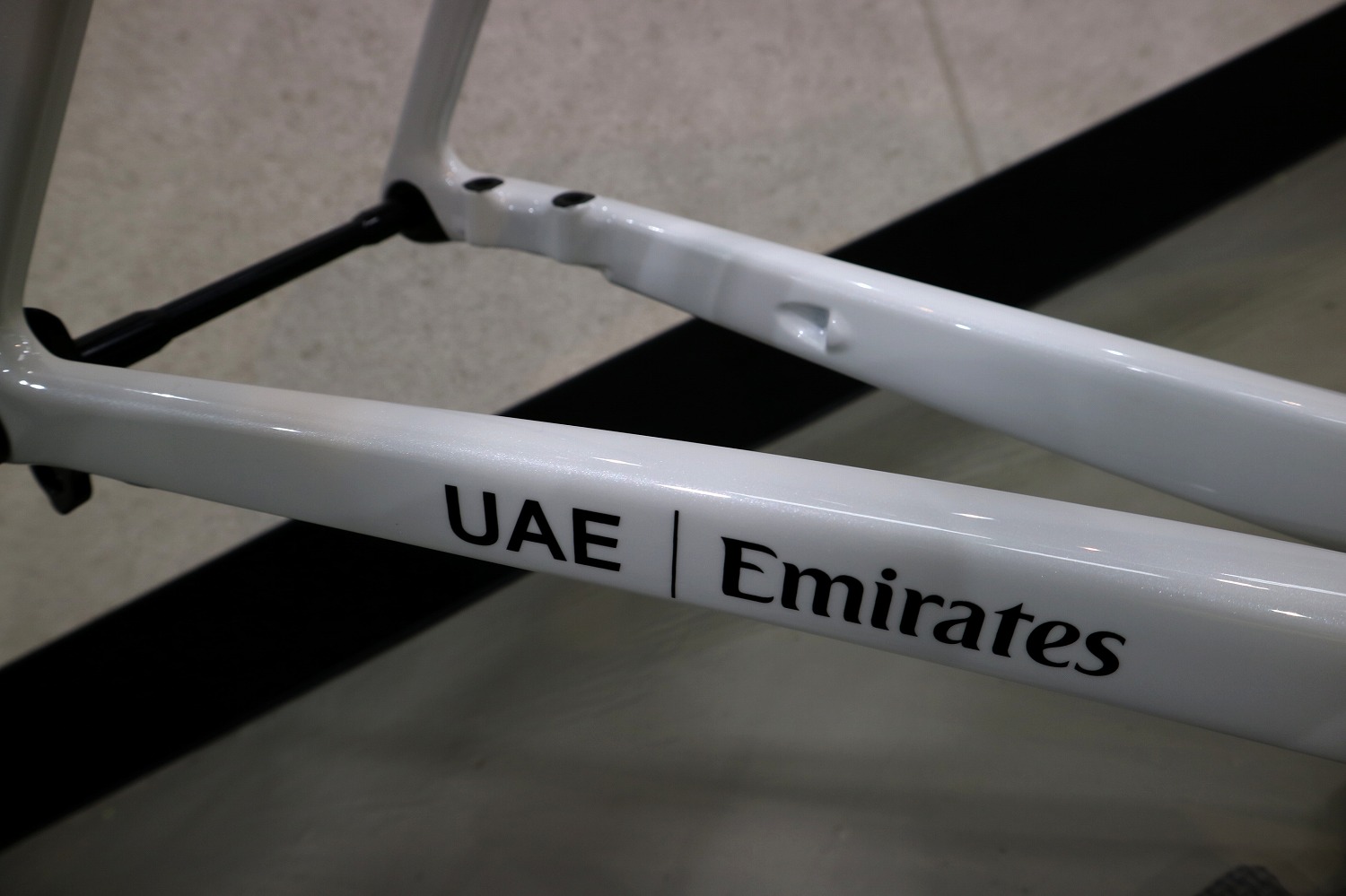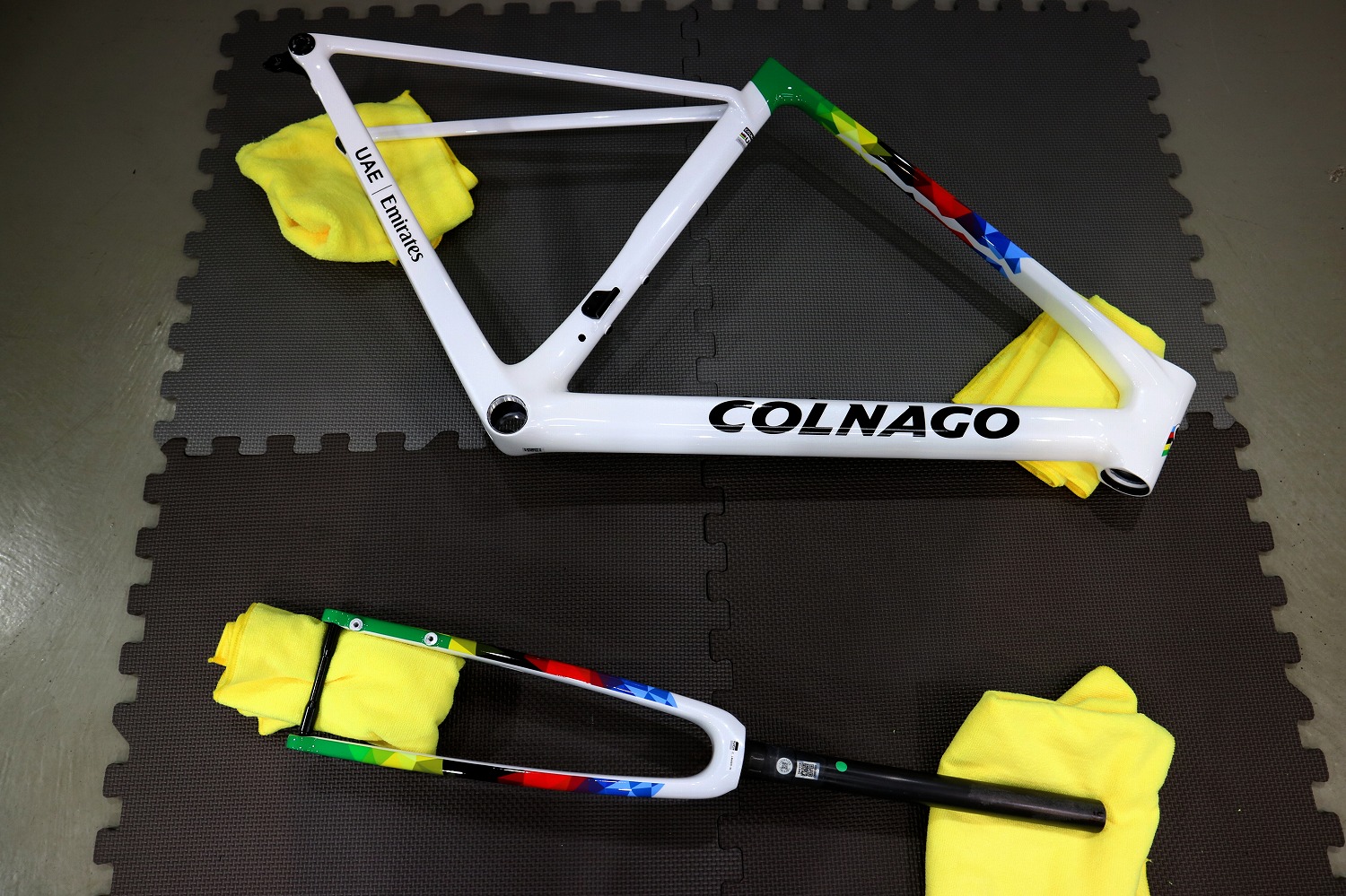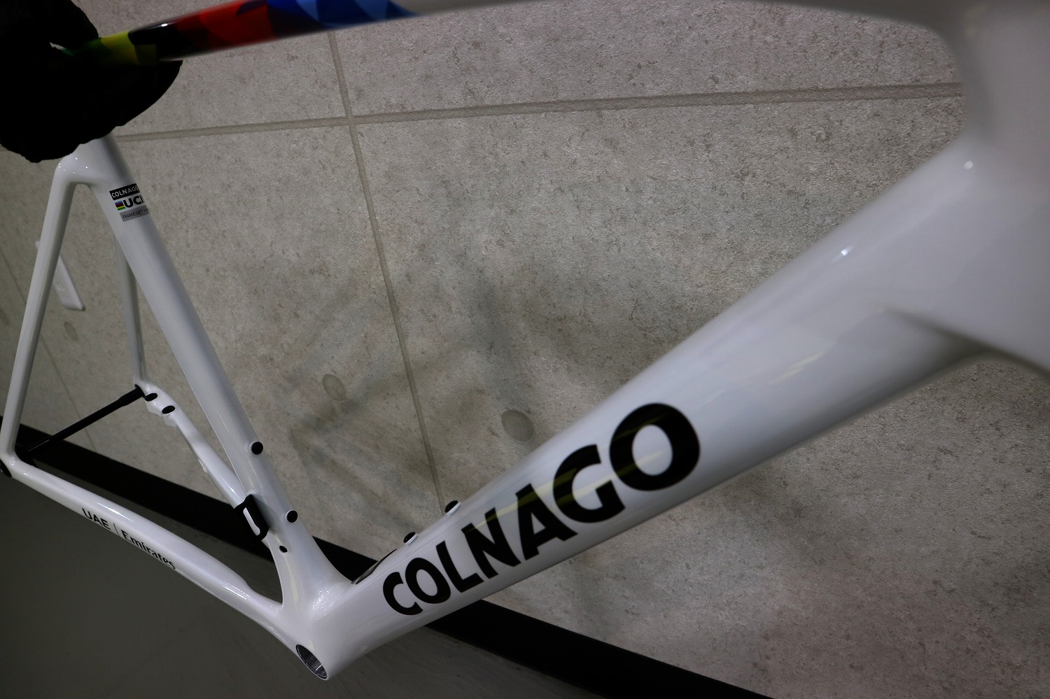 「UAE Emirates」のロゴをまとった Colnago V5Rs のフレーム&フォークは、世界最高峰レースの現場と直結した特別な存在です。UAE Team Emirates が実戦で使用するチームカラーを再現したデザインは、単なる見た目の特別仕様ではなく、プロチームとの共同開発によって磨かれた性能の象徴でもあります。