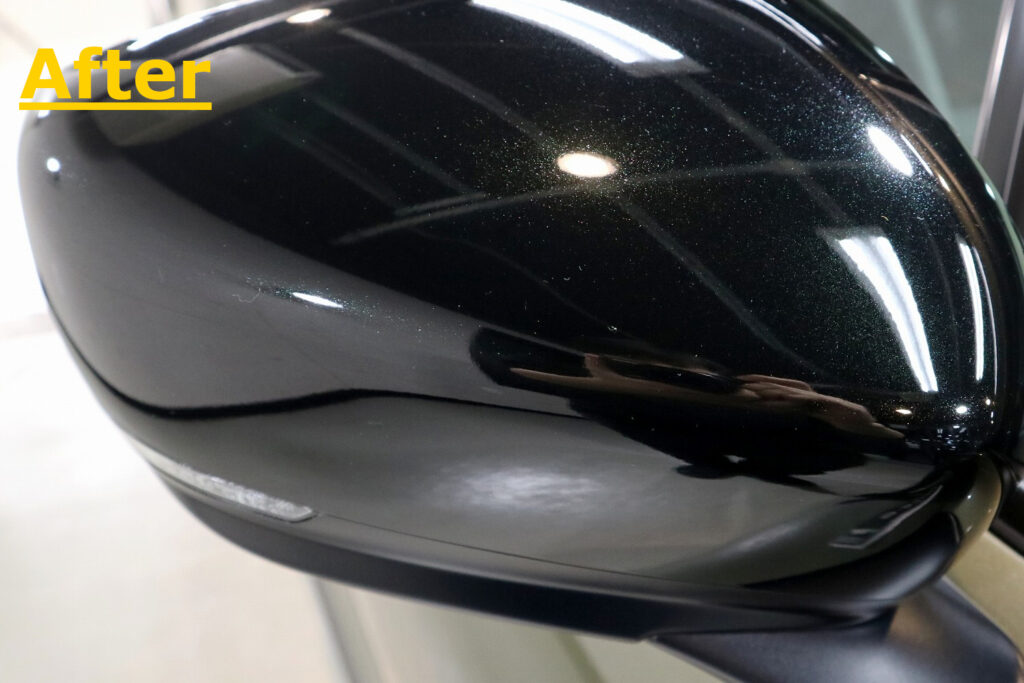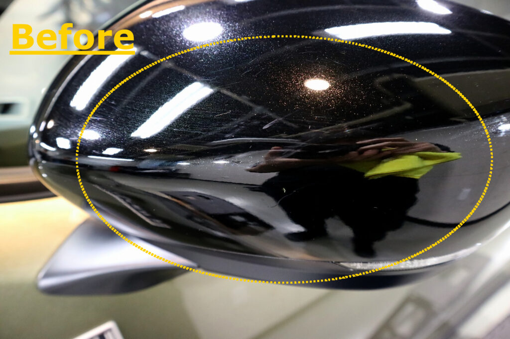 サイドミラーにこすったようなキズがありました。サイドミラーのように外に出っ張っているパーツは、やはりキズが入りやすいですが、丁寧にゆっくりとキズを除去します。