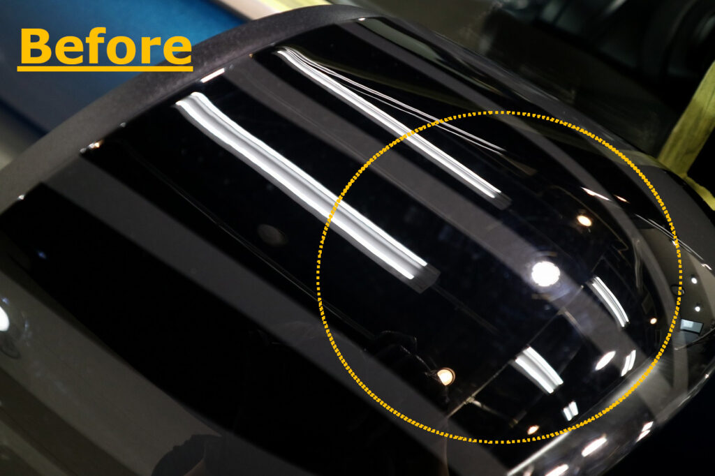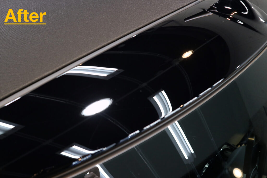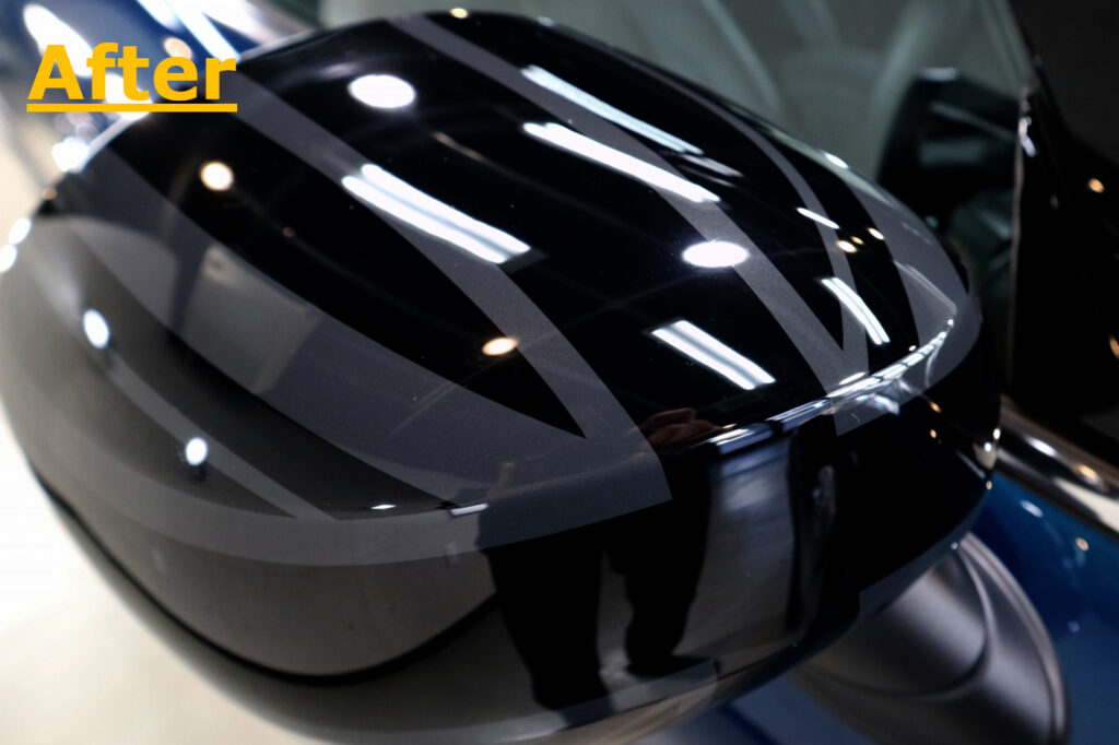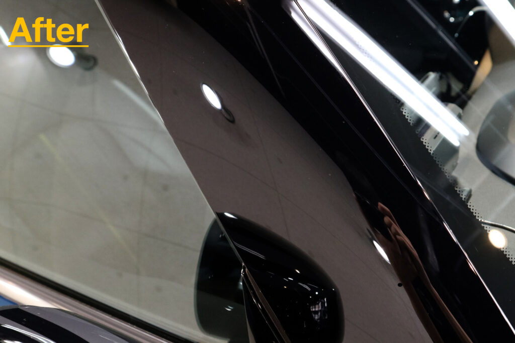 フロントピラーはピアノブラックのため、意識をしなくても洗車キズなどでキズが入りやすい箇所です。下地処理における研磨にてできる限り除去してからコーティングを行っています。