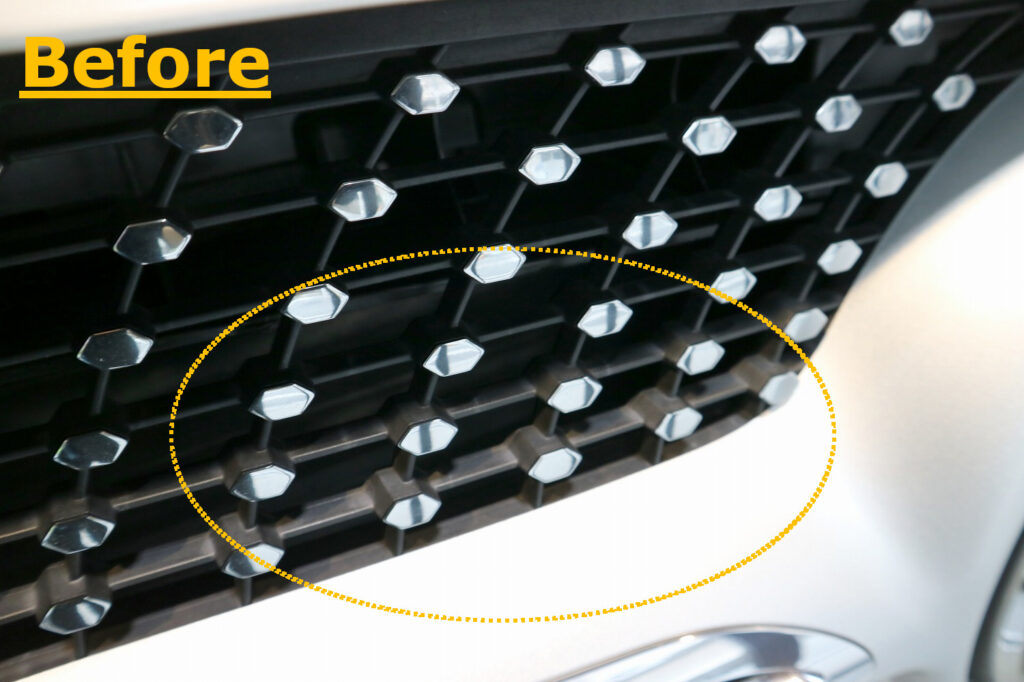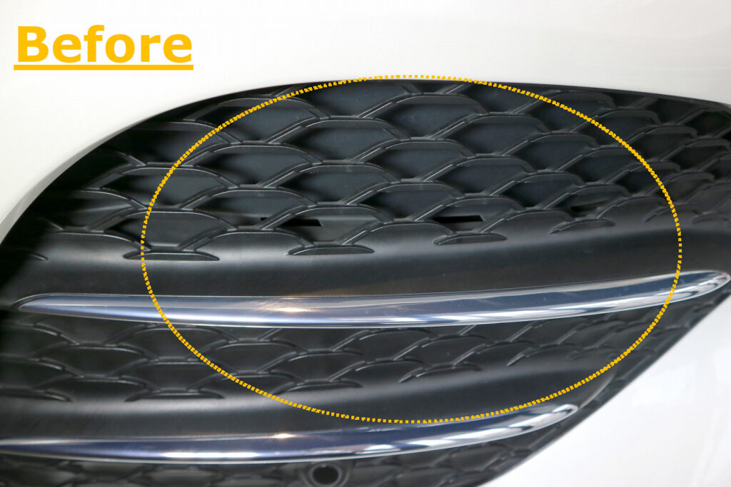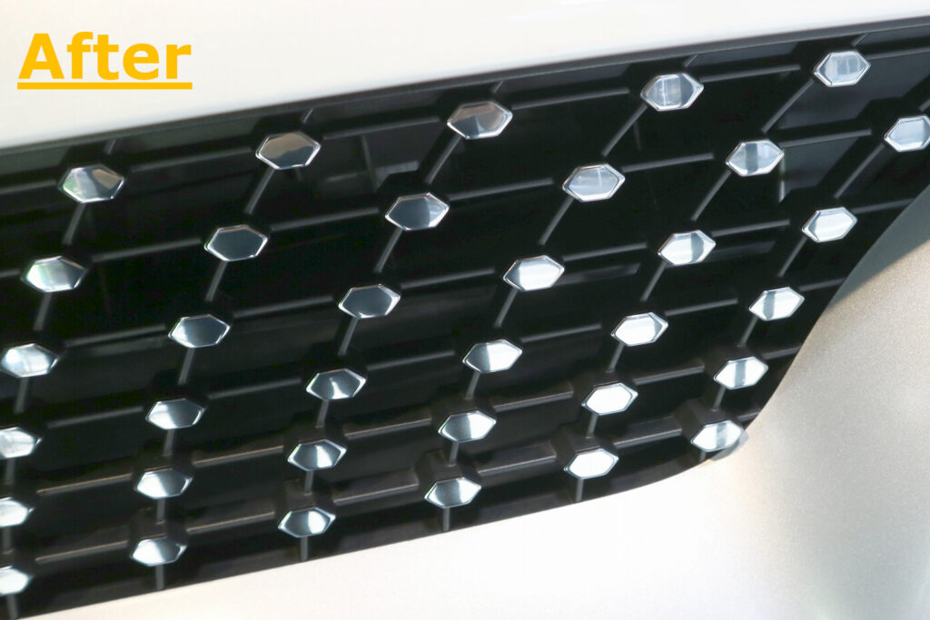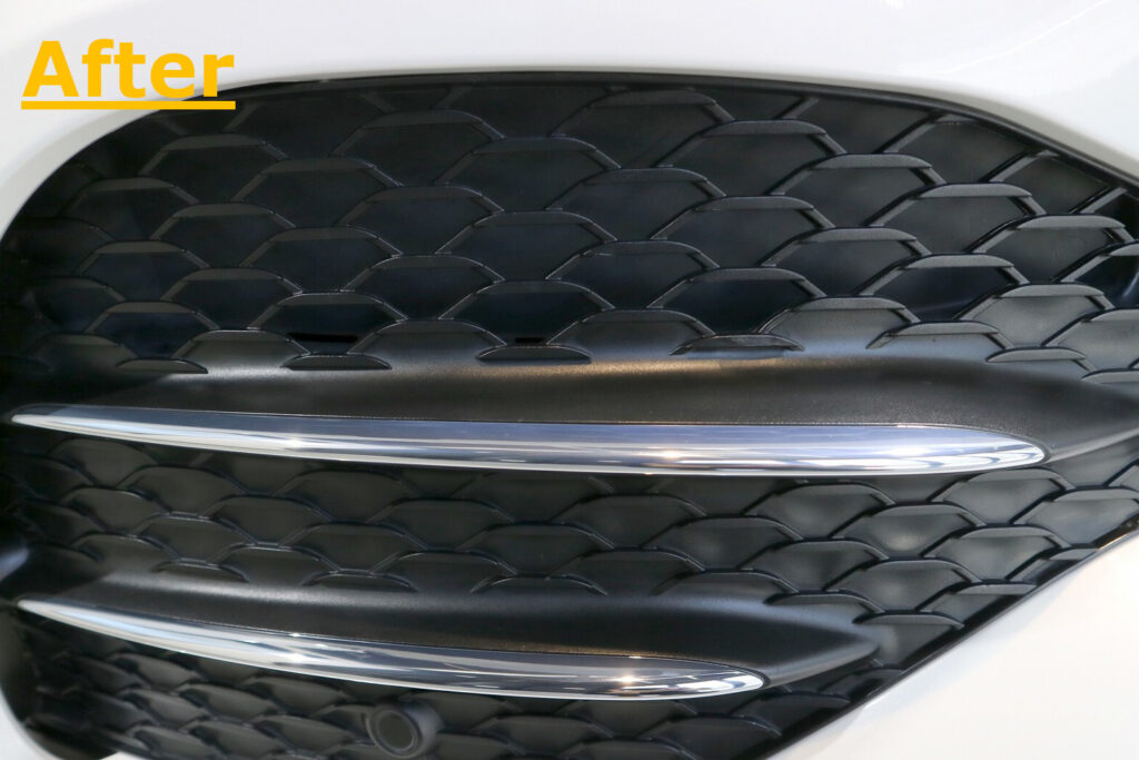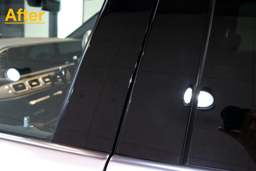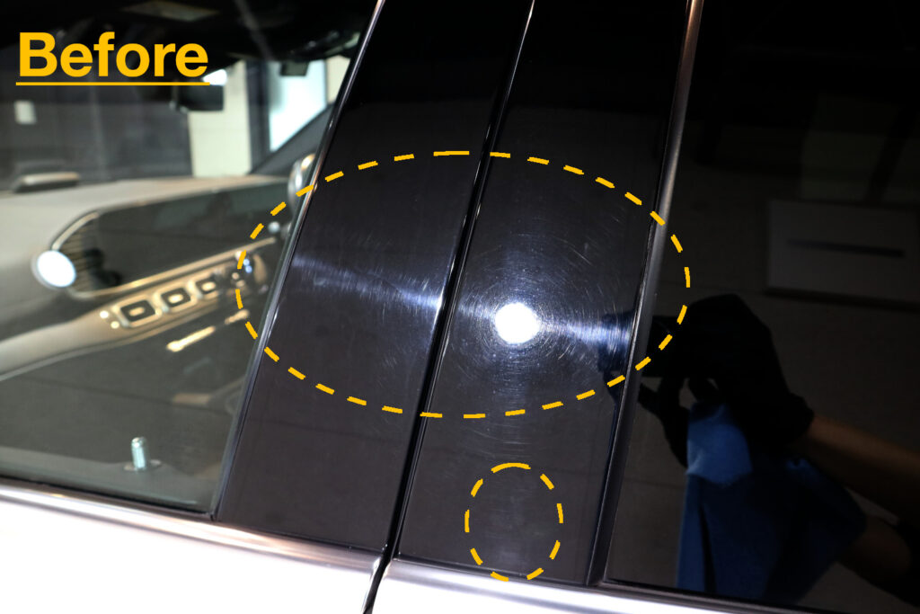 ピアノブラック樹脂のピラーは、経年感が大きくでる箇所の一つです。ポリッシャーとコンパウンドで丁寧に磨くと、キズの多くを除去することができます。